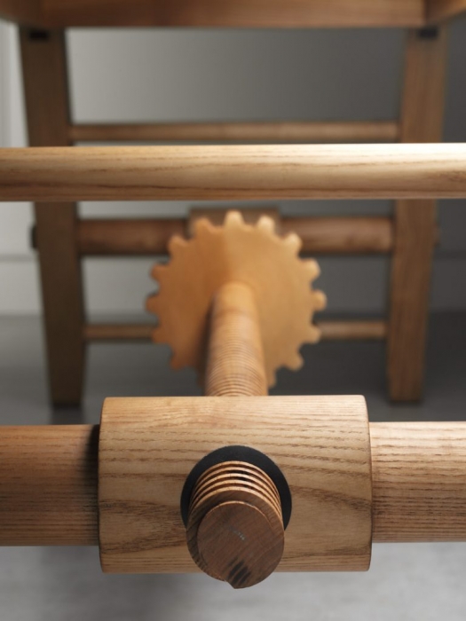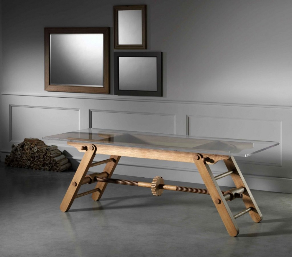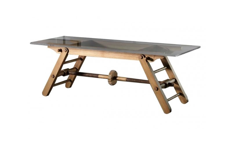 Il piano in vetro conferisce leggerezza estetica, permettendo di svelare i particolari costruttivi, protagonisti del tavolo: gli incastri e snodi della base consentono di regolare l’altezza in 3 misure, attraverso un meccanismo a vite senza fine.