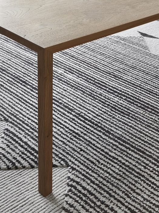 Il top, di 35 mm di spessore, è un pannello composito portante realizzato da un’intelaiatura interna in profilato di alluminio e un riempimento in polistirene. Gambe in acciaio, di sezione 35x35 mm, con tirante strutturale interno.