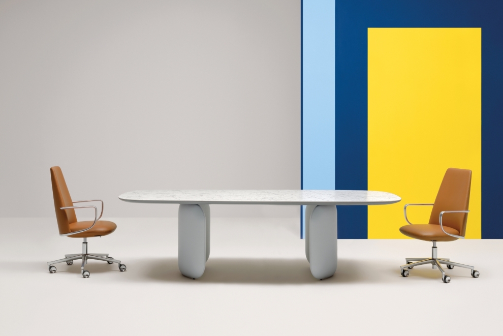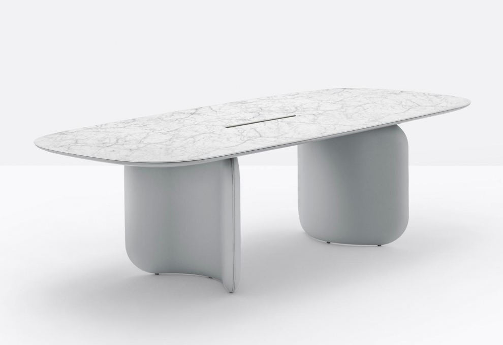 Elinor di Pedrali è caratterizzata da forme morbide e sinuose, è raffinata e contemporanea. tavolo con base costituita da due elementi sagomati di dimensione fissa realizzati in poliuretano rigido e rivestiti in pelle, ripiano rettangolare in stratificato ultrasottile di 6 mm con canalina e sottopiano in mdf laccato dalla forma bombata, che nasconde la parte strutturale in acciaio. i due elementi che compongono la base vengono collocati in maniera simmetrica. sono disponibili due configurazioni che danno vita a risultati estetici differenti: a parentesi chiusa o aperta.