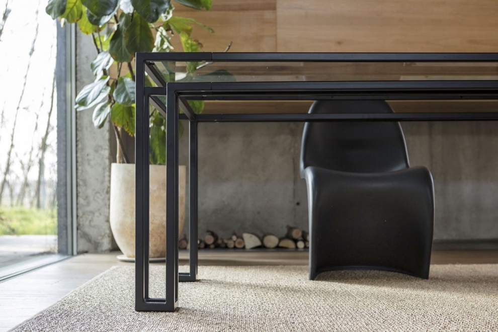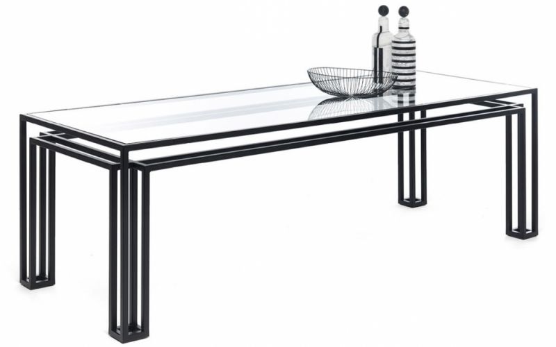 Hotline è un tavolo con struttura in metallo e piano in cristallo. La struttura è disponibile nella finitura nera con piano in vetro trasparente.