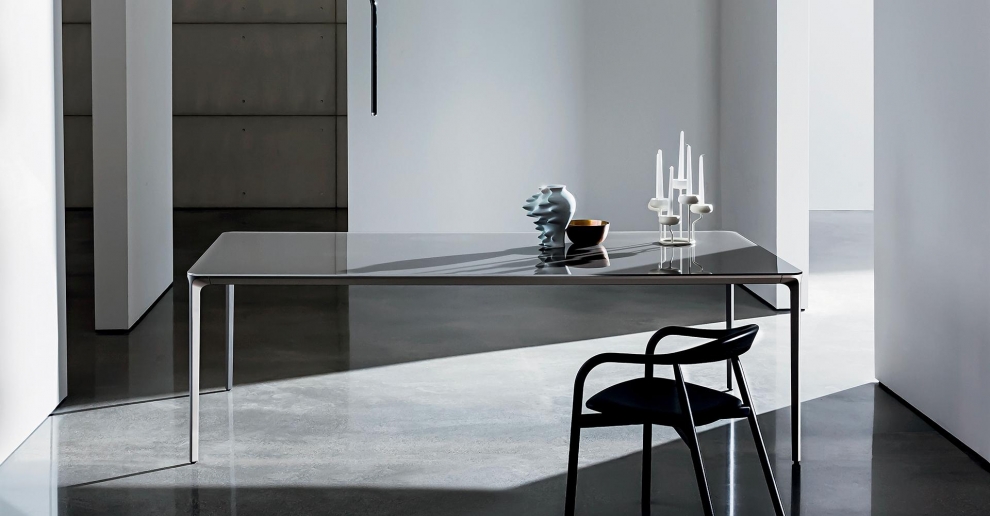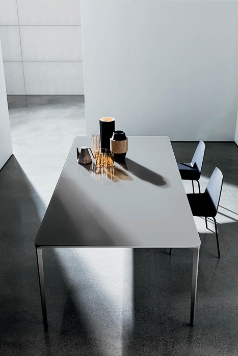 Il tavolo Slim di Sovet unisce eleganza e leggerezza con un design essenziale. Struttura e gambe in metallo verniciato offrono solidità, mentre il piano in vetro acidato laccato dona raffinatezza e luminosità. Perfetto per ambienti moderni, coniuga estetica minimale e materiali di alta qualità.