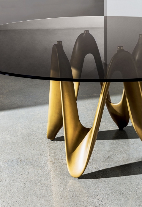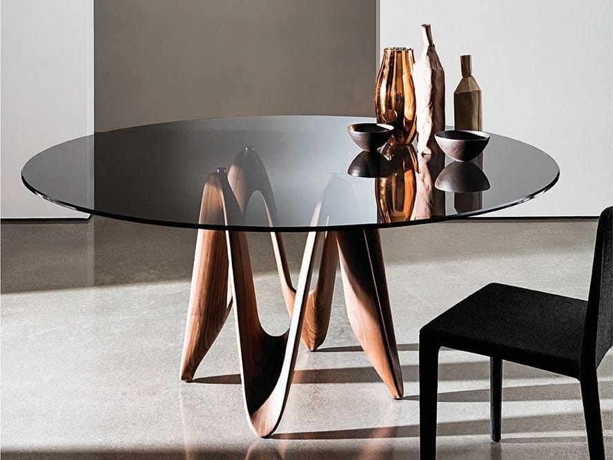 Tavolo Lambda con base in cristalplant bianco opaco, nero, brunito.‎ Disponibile anche in legno di frassino con finitura tinto rovere o wengé, o in legno massello noce canaletto.‎ Top in vetro temperato trasparente extrachiaro o fumé, o in ceramica, varie finiture.‎ Piano disponibile anche nell’esclusiva finitura LIQUID GLASS.‎