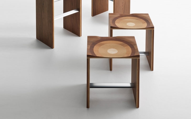 Sgabello realizzato con uno speciale ed esclusivo multistrato di cinque differenti essenze di legno (noce canaletto, mogano, ciliegio, rovere e frassino). Poggiapiedi in alluminio nodizzato trafilato.