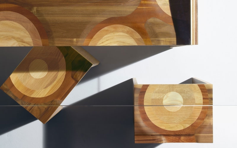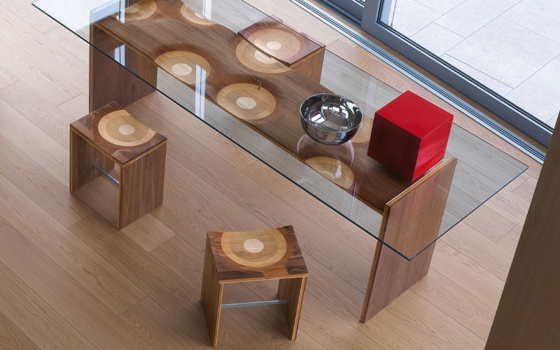 La panca Ripples di Toyo Ito, vincitrice del Compasso d’Oro 2004, ha dato origine a una piccola collezione composta da diversi complementi d’arredo. Uno di questi è lo sgabello, composto da un multistrato di cinque differenti legni massello. La seduta, scolpita con tecnica industriale ma rifinita interamente a mano, è morbida e avvolgente grazie alla duttilità del legno e alla passione di Horm.it per le tecniche di lavorazione artigianali.