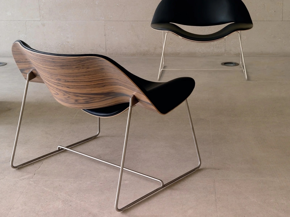La conformazione ricurva si ripete nella parte superiore, dove si trova la scocca del prodotto. Questa è costituita da un’impiallacciatura multistrato in legno zebrano, trattata poi con una verniciatura anti-ingiallente al naturale e sbiancata in modo leggero, mentre la seduta e lo schienale hanno un’imbottitura riempita con poliuretano espanso.