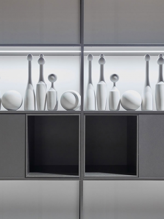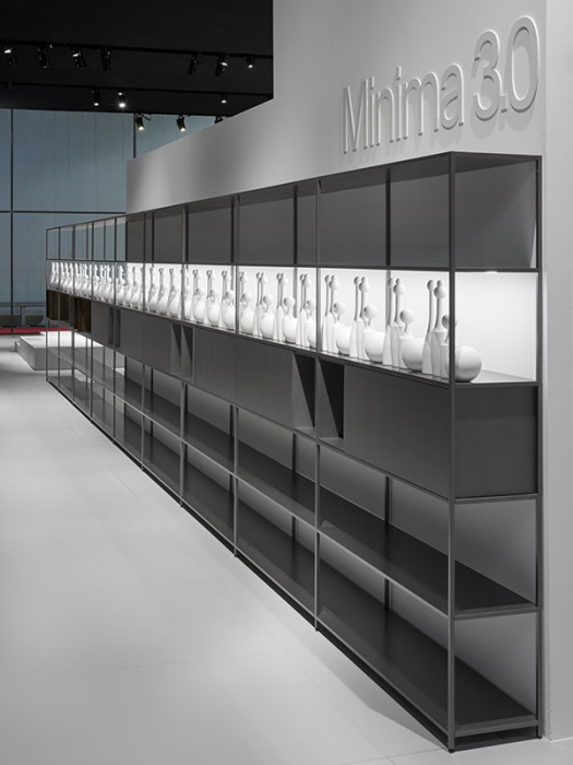 Tecnologia ed innovazione hanno permesso a questa esile struttura in alluminio, di proporre un segno ancora più minimale e fortemente identitario. I contenitori (anta, ribalta, cassetti e giorno) sono semplicemente in appoggio all'interno della struttura e riposizionabili con estrema facilità. Montanti e ripiani realizzati in estrusione di alluminio (riciclabile al 100%), finitura verniciata opaca nei colori bianco e grigio grafite e nelle nuove finiture grigio ombra e nichel perla. I contenitori, sono in laccato opaco microgoffrato o essenza. Minima 3.0 è disponibile nella variante terra (otto altezze) e pensile (quattro altezze), sempre nella profondità 33 cm.