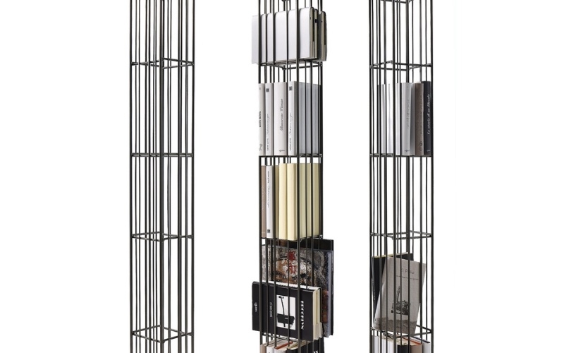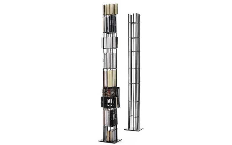 Metrica Tower è una libreria autoportante in metallo brunito. La struttura è semplice, il ritmo è scandito dalle bacchette di ferro fissate a diversi intervalli su una struttura apertamente rigorosa entro la quale i libri inseriti ne completano la forma.