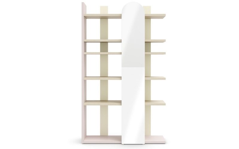 La libreria Surfy ha una struttura leggera, così può diventare facilmente anche una parete divisoria. È disponibile alta, con fianco dritto e nella sua versione alta si può mettere lo specchio!