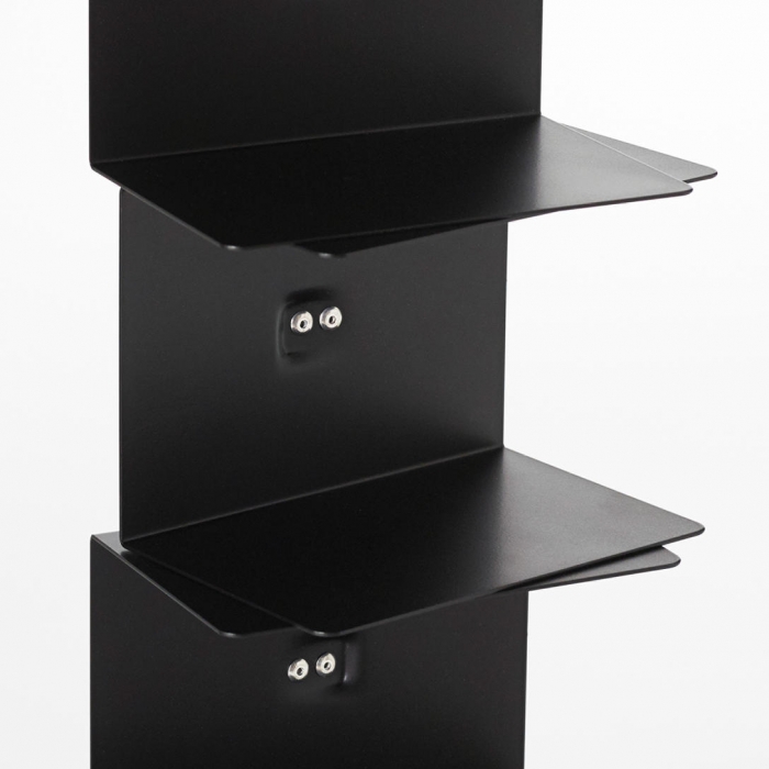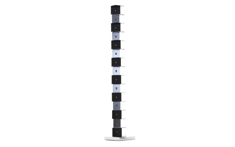Hai esigenze particolari, dimensioni, finiture, quantità, trasporto, ecc…?Libreria verticale Ptolomeo self standing in acciaio, con struttura nera e base in finitura inox, incisa con la firma del designer.