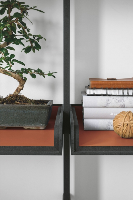 Il bordo nero dei ripiani dà ulteriore personalità alla libreria: l’anima del materiale non viene nascosta bensì esibita e valorizzata, come gli oggetti e i libri. Lo stile diventa un tutt’uno con la funzionalità dell’arredo.
