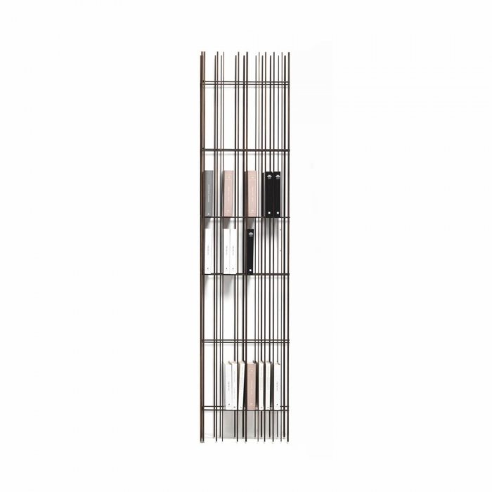 Hai esigenze particolari, dimensioni, finiture, quantità, trasporto, ecc…?La libreria Metrica del marchio Mogg, è realizzata in tondino di ferro, brunita con ripiani in cristallo colore bronzo.