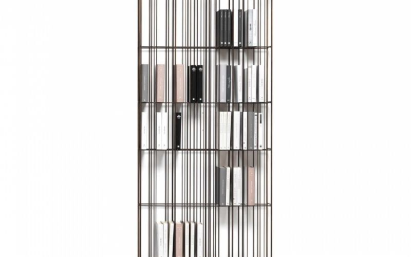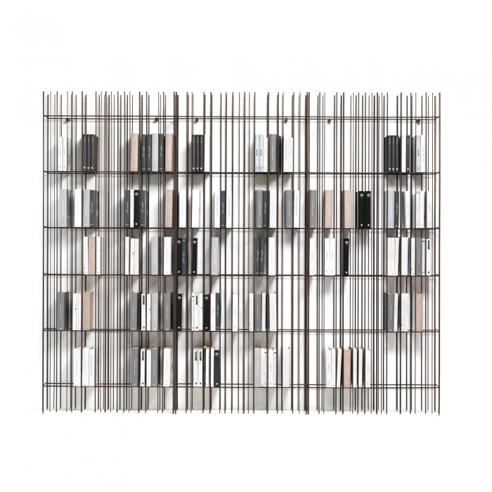 La struttura semplice sfrutta la lavorazione industriale del tondino cadenzato in differenti diametri e secondo una partizione irregolare. Il volime essenziale si delinea grazie all'incontro di linee rette: il ritmo è scandito dalle bacchette posizionate ad intervalli diversi su una struttura apertamente rigorosa entro la quale i libri e gli oggetti inseriti ne completano la forma scrivendo di volta in volta nuove composizioni.