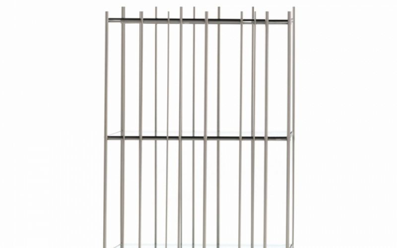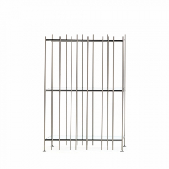 Metrica è una libreria in metallo disponibile nelle finiture titanio, brunito e oro con ripiani in cristallo trasparente disponibili in bronzo o verde. La struttura è semplice, il ritmo è scandito dalle bacchette di ferro fissate a diversi intervalli su una struttura apertamente rigorosa entro la quale i libri e gli oggetti inseriti ne completano la forma scrivendo di volta in volta nuove composizioni.