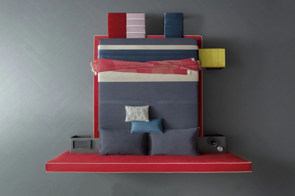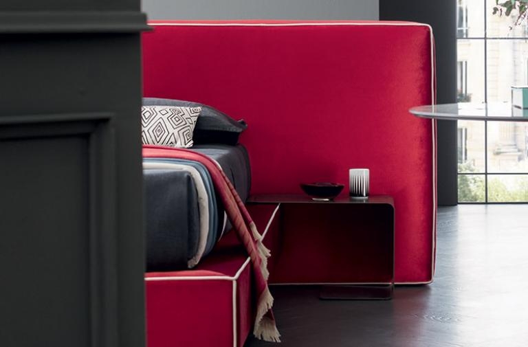 Optional escluso dal prezzo: Realizzato in metallo curvato, l’elemento a bordo letto può diventare un pratico tavolino, per tenere ogni cosa a portata di mano, ma si può anche muovere intorno al ring per diventare una comoda seduta.