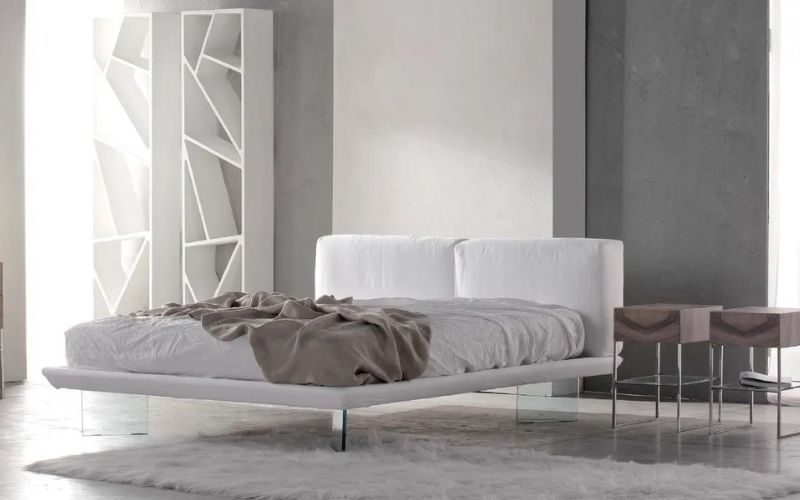 Letto modello Oplà del marchio Voltan, con testata e giroletto imbottito rivestito in tessuto sfoderabile. Il letto è esaltato dai piedini in vetro trasparente.