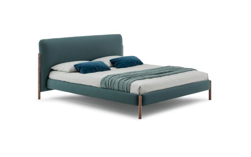 Il letto Flag di Bolzan ha proporzioni accuratamente studiate per collocarsi facilmente anche negli spazi più piccoli.‎ Le gambe a sezione tonda in legno di noce (con varie finiture), posizionate esternamente, definiscono il volume all’incrocio tra longoni e pediera, mentre ai lati della testiera si allungano per accogliere diversi terminali: il cappuccio in ottone oppure i vassoi girevoli (in configurazione singola o doppia) sempre in ottone, che possono sostituire i comodini in un’interpretazione contemporanea della camera da letto.‎