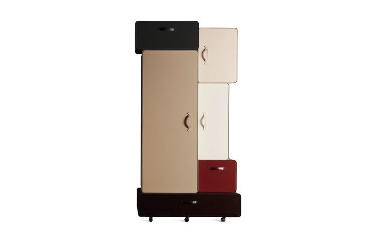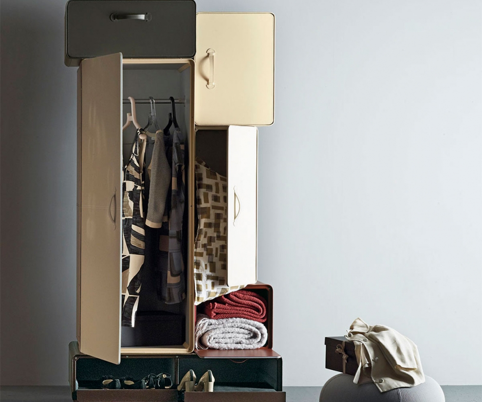 Hai esigenze particolari, dimensioni, finiture, quantità, trasporto, ecc…?Valises di Horm offre una soluzione originale per sistemare con stile vestiti, scarpe ed accessori. I vari moduli a forma di valigia sono rivestiti in cuoietto. Valises ripropone l’eleganza del passato, rivisitandola in chiave moderna e divertente. Il progetto mira ad evocare il fascino lussuoso della maglieria in pelle. Il mobile è composto da 6 ‘moduli’, ognuno creato appositamente per accomodare i vari generi di abbigliamento. Un puzzle perfetto per ospitare i vestiti più belli, le scarpe più preziose e gli adorati cappelli di ognuno. L’idea del designer è quella di creare un sistema dinamico e flessibile, antitetico ai tradizionali armadi grandi, pesanti e difficili da trasportare.