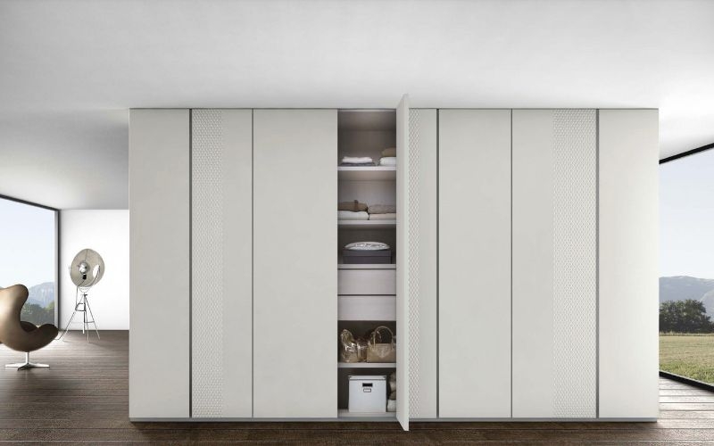 Armadio Oplà di Voltan, proposto nella versione con ante battenti, impreziosita dal dettaglio dell'incisione sulle ante.