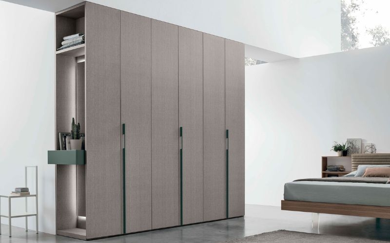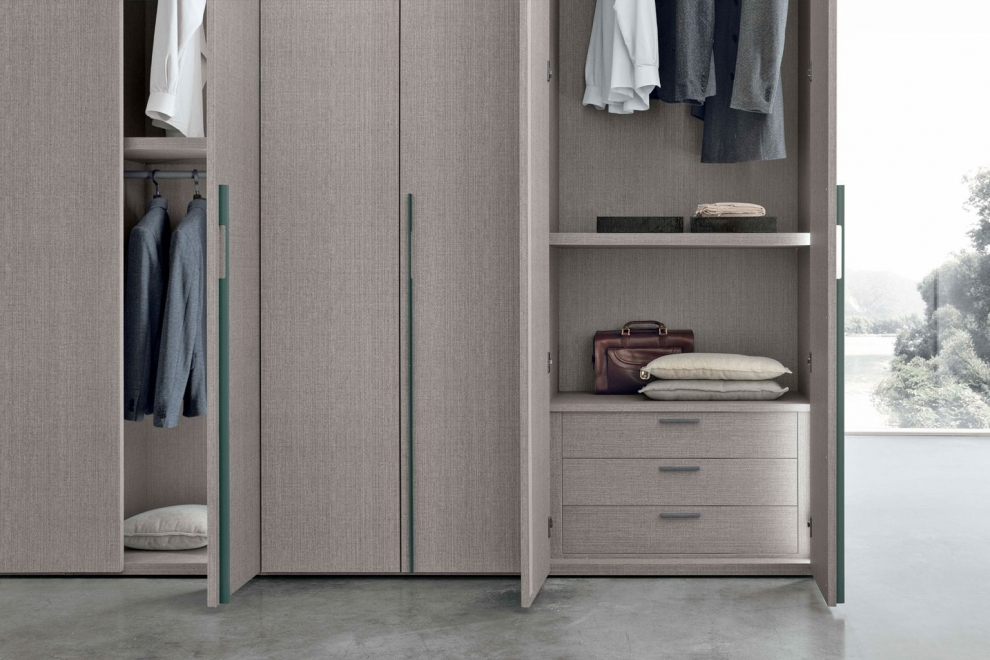 Anche gli interni dell’armadio sono curati nella funzionalità e nell’estetica: lo spazio può essere attrezzato e organizzato con ripiani, cassettiere e altri accessori, mentre la finitura effetto tessuto rifinisce e completa lo stile d’insieme.