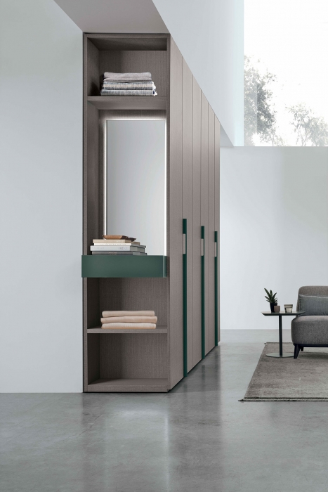 Visto frontalmente è un armadio battente con una maniglia di design applicata sull’anta, ma lateralmente svela un altro lato del suo carattere: il vano a a giorno terminale è attrezzato con una specchiera e un cassetto. Una pratica postazione per vestirsi e prepararsi.