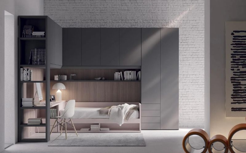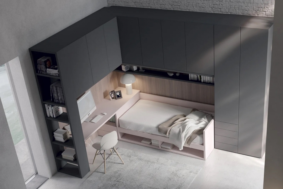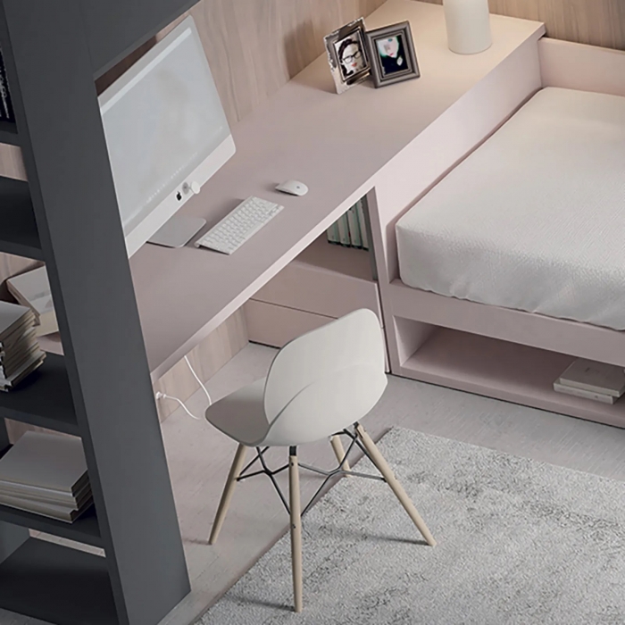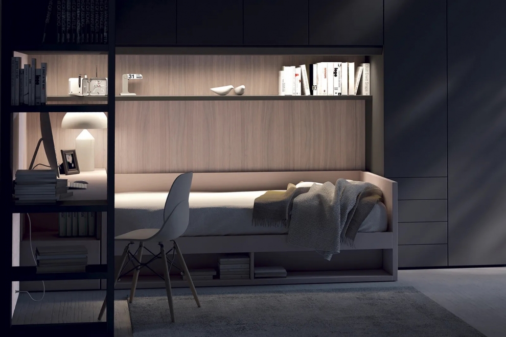 La colonna terminale a libreria offre un elegante momento di leggerezza alla composizione e permette di mettere in bella mostra libri e oggetti d'affezione. La scrivania sagomata retro-letto permette di ottimizzare ogni centrimentro dello spazio sotto-ponte, lasciando inoltre lo spazio per una piccola cassettiera.