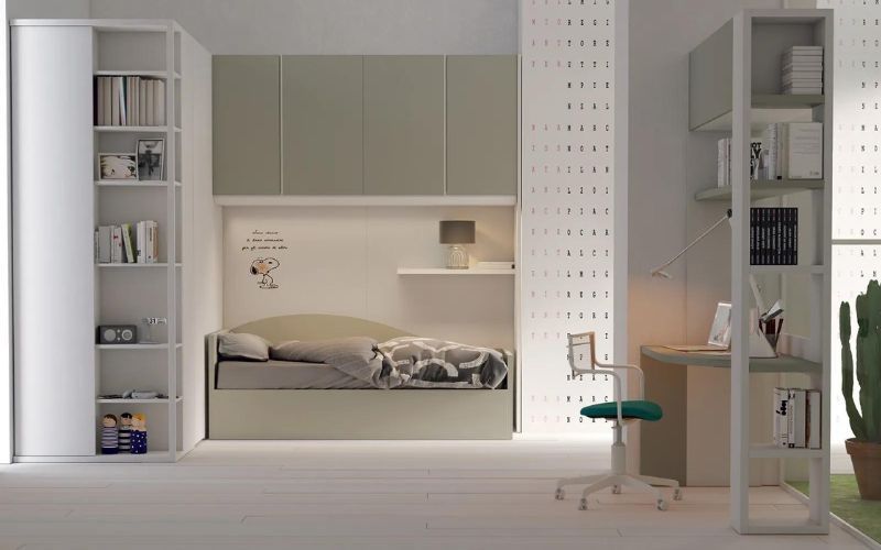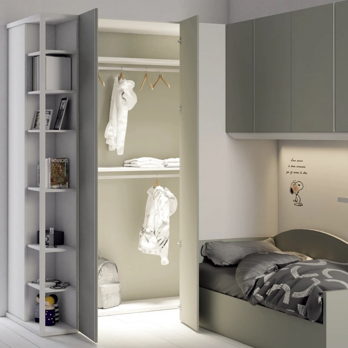 Per allargare lo spazio nella cameretta senza rinunciare al contenimento, la scelta di un armadio a ponte sopra al letto è ottimale. Se poi si accosta al ponte una maxi cabina armadio XCAB, lo spazio per tutto è assicurato. L'elevata capacità di contenimento della cabina armadio XCAB è infatti ottimizzata secondo le necessità grazie all'ampia scelta di attrezzature e configurazioni interne.