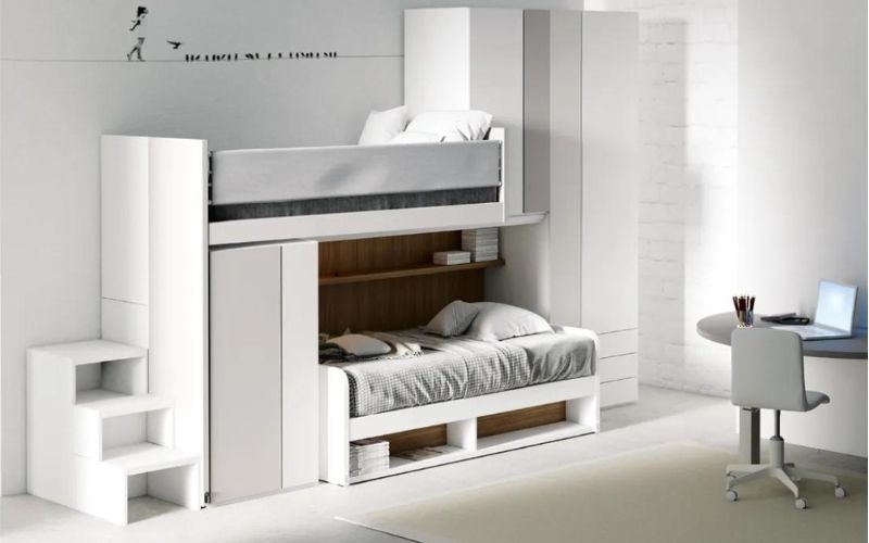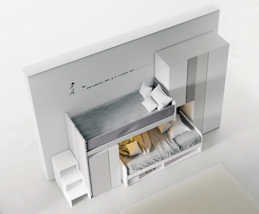 Genialponte è la soluzione ideale per l'arredamento di una camera dedicata a due ragazzi. Recuperare due metri quadrati di spazio è facile con il letto a soppalco incorporato nella composizione!
