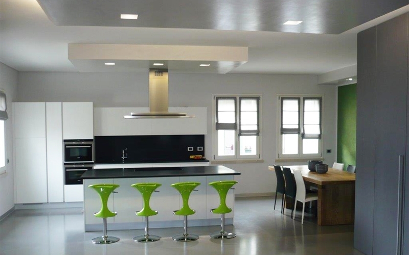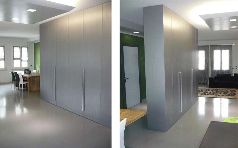 Progetto di interni e fornitura di arredi di una zona giorno open space moderna in cui un armadio diventa elemento separatore e la cucina diventa protagonista dell'area.